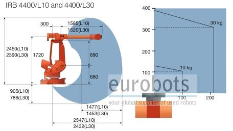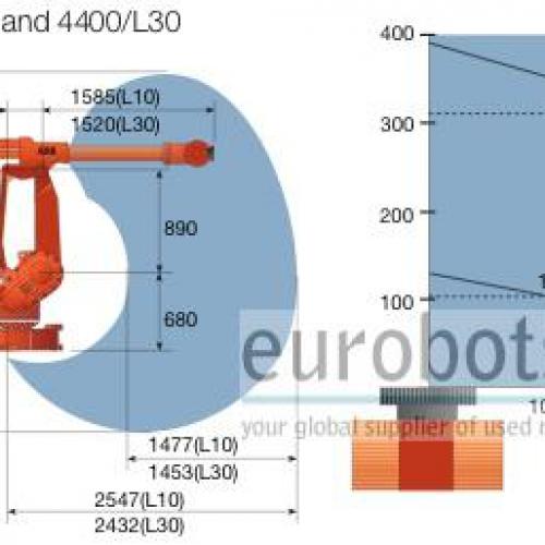 Versión de brazo largo del ABB IRB4400 con un alcance horizontal de 2.432 mm. Robot altamente ágil y compacto para tareas de manipulación de cargas medias y pesadas. Debido a su excelente versatilidad es apropiado para muy variadas aplicaciones. Equipado con el controlador S4C con un diseño renovado frente a su predecesor S4. Las instrucciones RAPID de este control facilitan la programación.