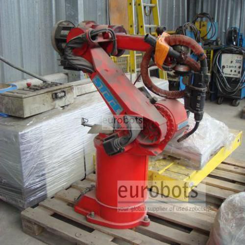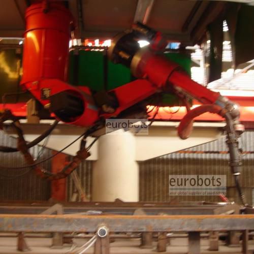 Year 2002. 6 axis industrial robot Reis type SRV6 (Robotstar V controller) suspended on a 17 m hub linear track. Two 1 axis servocontrolled positioners 8 m length (head-tailstock) along the track with a nominal payload of 2500 kg each.
